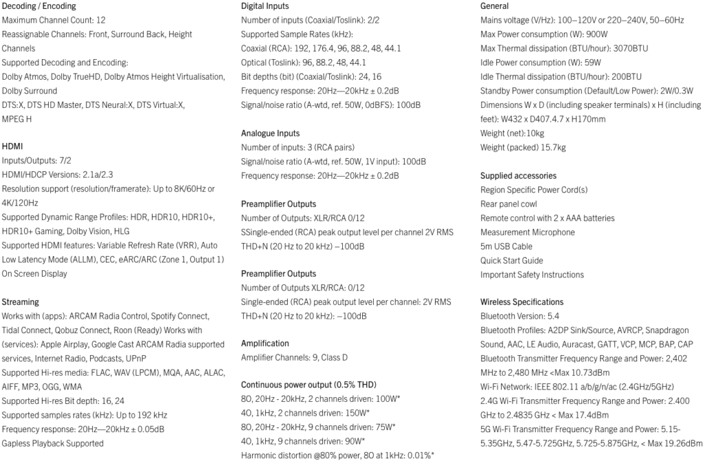 The AVA15 brings breathtaking clarity and depth to every note and every scene, putting you at the heart of the performance. Expertly engineered in Cambridge, UK, and built on over 30 years of surround sound expertise, the AVA15 combines our passion for music with cutting-edge technology. Its powerful Class D amplification and advanced immersive audio processing deliver a sound that’s as thrilling as it is precise. With nine channels of amplification, the AVA15 drives setups like 7.1.2 or 5.1.4 with ease—and gives you room to expand with extra subwoofers, height, or surround speakers. Dolby Atmos and DTS:X bring cinema-grade immersion to your home, while Dirac Live room correction ensures every detail sounds perfect in your space. At ARCAM, sound quality isn’t just a promise—it’s our obsession. The AVA15 is the result of rigorous testing and listening sessions to award it the ARCAM name and with a vibrant 6.5″ colour display, intuitive on-screen menus, and the new Radia App, setup and streaming are effortless.